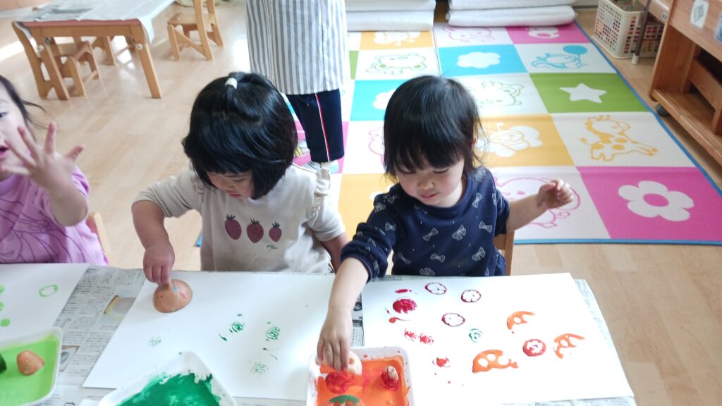 2026.2.27 食育~野菜スタンプ~(0~2歳児) ピーマン、玉ねぎ、にんじん、れんこんなどの野菜を使って画用紙にポンッ! 普段食べている野菜がいろいろな模様に変身し、とても楽しんでいました。 < アルバム一覧にもどる < 2026.3.2 給食センター見学(5歳児) 2026.2.20 通学路体験(5歳児) >
